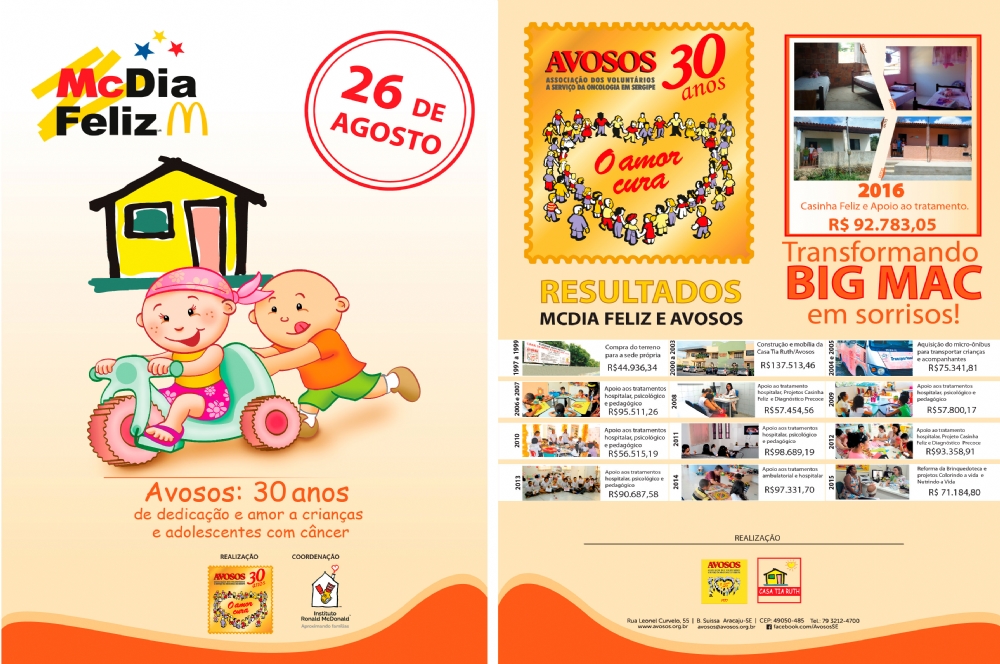 “O McDia Feliz, antes de tudo, tem o objetivo de despertar a atenção de toda a sociedade e sensibilizá-la para a maior causa de morte por doença entre crianças e adolescentes de 0 a 19 anos. A meta desta campanha é contribuir para o aumento dos índices de cura do câncer infantojuvenil. É uma alegria para Avosos ter sido escolhida mais uma vez para realizar aqui em Sergipe esta iniciativa”, informa a voluntária.