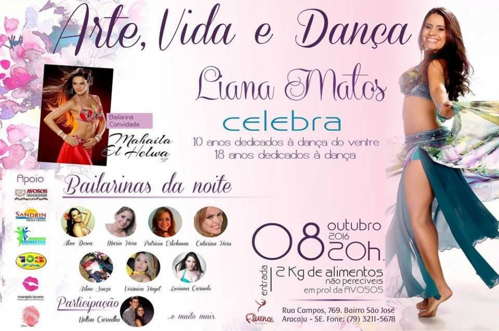No próximo sábado, 8, às 20h, acontece o espetáculo de dança do ventre ´Arte, Vida e Dança´, organizado pela bailarina Liana Matos, que dedica 18 anos à dança, sendo 10 à dança do ventre. “A ideia desse projeto surgiu há algum tempo e somente agora pude pôr em prática. O evento surge para comemorar meus anos dedicados à dança, porém unir a arte com a solidariedade sempre foi um dos meus objetivos enquanto bailarina”, informa Matos.