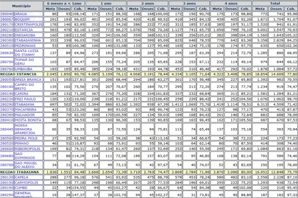 De acordo com os dados preliminares repassados pelas secretarias estaduais e municipais de Saúde até as 12h desta segunda-feira (17), os estados com as maiores coberturas vacinais foram: Rio Grande do Sul (76,4%), Paraná (76,4%), Rondônia (75,5%), Amazonas (73,1%), Goiás (71,2%) e São Paulo (71,1%). O melhor desempenho por subgrupo de idade até o momento foi entre as crianças de 6 meses a menores de 1 ano, atingindo 72,56% do público-alvo, o que representa 1.058.062 doses aplicadas.
