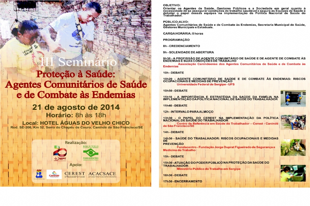 Em Canindé, além dos anfitriões, devem participar do Seminário profissionais dos municípios de Poço Redondo, Porto da Folha, Monte Alegre, Feira Nova, Gararu, Gracho Cardoso, Nossa Senhora da Glória e Itabi. O evento é coordenado pelo MPT e pela Fundacentro, em parceria com a Universidade Federal de Sergipe, a Prefeitura de Canindé, o Cerest e a Associação Canideense dos Agentes Comunitários de Saúde e de Combate às Endemias.