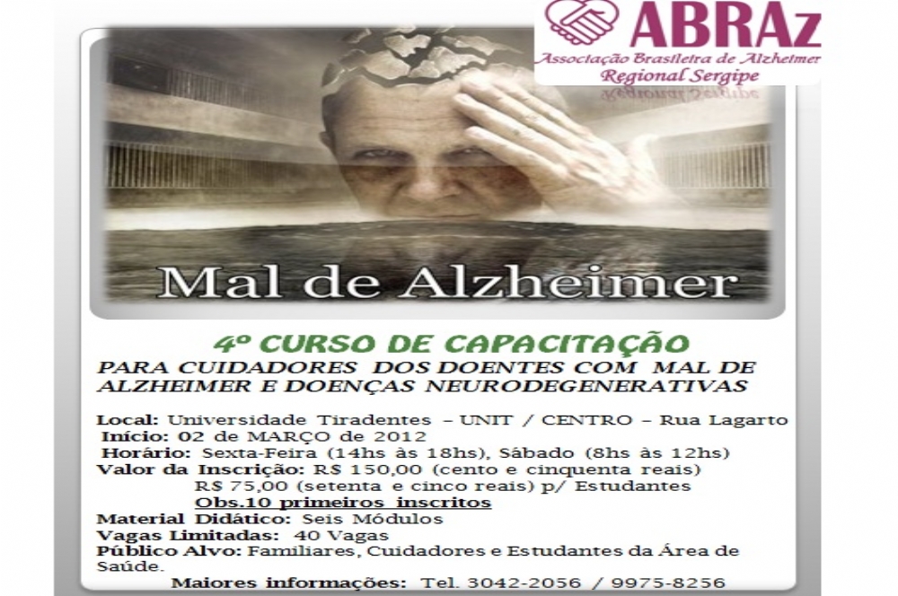 Estão abertas as inscrições para o 4º Curso de Capacitação para cuidadores dos doentes com Mal de Alzheimer e doenças neurodegenerativas. O curso terá início na quinta-feira, 2, e ocorrerá na Universidade Tiradentes, localizada na rua Lagarto, Centro. Mais informações por meio do (079) 3042-2056 9975-8256.