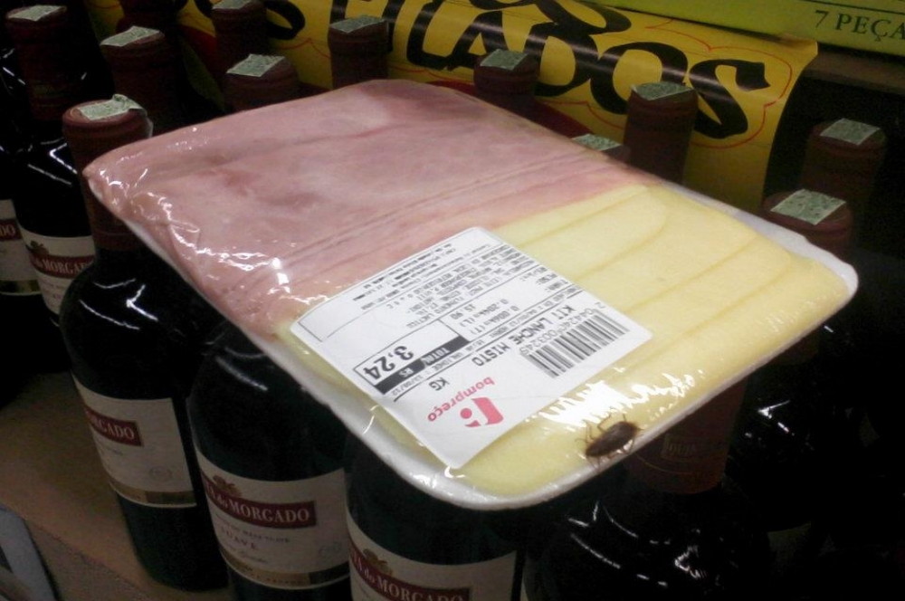 Ele contou ainda que o prato estava em cima de garrafas de vinho, próximo ao local de refrigeração. “A barata já estava quase entrando no plástico. Me aproximei, tirei a foto e saí. Dez minutos depois, voltei ao mesmo local e tanto a barata quanto o produto continuavam lá”, conta.
