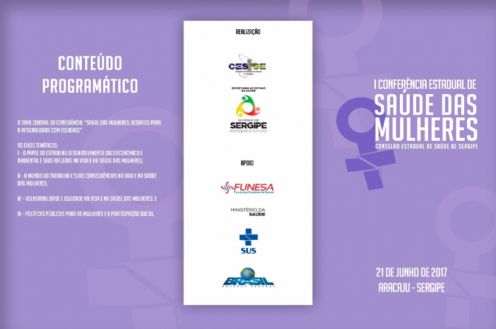 O Conselho Estadual de Saúde, realiza no dia 21 de junho, a partir das 08h, a I Conferência Estadual de Saúde das Mulheres, que acontecerá no Clube do Banese, localizado no bairro Coroa do Meio, com o tema "Saúde das mulheres: desafios para a integralidade com equidade".