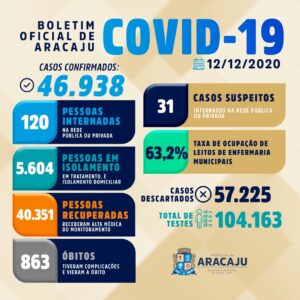 A Secretaria Municipal da Saúde de Aracaju informa que até as 18h deste sábado, 12, foram registrados 501 novos casos de Covid-19 na capital e dois óbitos. Sendo um homem com 97 anos, com hipertensão e diabetes, que veio a óbito dia 05 de dezembro, e uma mulher com 82 anos, sem comorbidade descrita, óbito dia 04 deste mês.