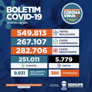 A Secretaria de Estado da Saúde (SES) divulgou nesta quarta, 07, o boletim epidemiológico do coronavírus, com 517 casos e seis óbitos que estavam em investigação e foram confirmadas. Em Sergipe, 267.107 pessoas já testaram positivo para a Covid-19 e 5.779 morreram. Até o momento, 251.011 pacientes foram curados.
