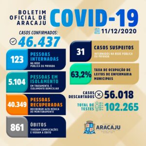 Com isso, sobe para 46.437 o número de pessoas diagnosticadas com Covid-19 em Aracaju. Dessas, 123 estão internadas em hospitais; 5.104 estão em isolamento domiciliar; 40.349, que estavam infectadas já estão recuperadas; e 861 vieram a óbito.