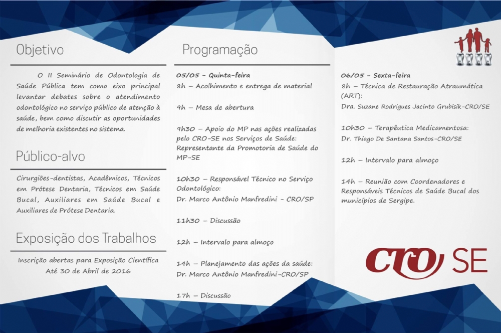 Durante o evento, haverá, ainda, espaço para a apresentação de práticas exitosas ou TCCs que se enquadrem dentro da temática da Odontologia na Saúde Pública, do qual participarão estudantes, cirurgiões-dentistas, auxiliares e técnicos em Saúde Bucal. As apresentações serão feitas em formato de banner ou painel, que ficarão expostos no local do Seminário, que conta com o apoio da Unit e do Conselho dos Secretários Municipais de Saúde (Cosems).A programação completa pode ser conferida no site www.crose.org.br ou no facebook.com/crosergipe.