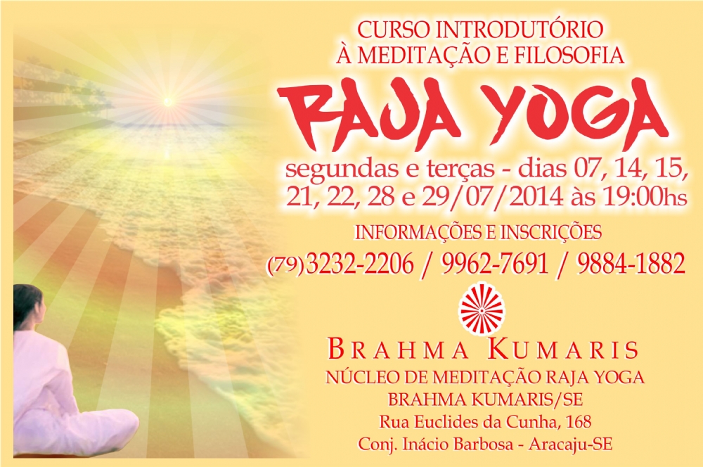 O Ponto de Serviço da Brahma Kumaris promove o curso de meditação Raja Yoga entre os dias 9 e 29 de julho de 2014. O curso acontecerá sempre das 19h às 20h30, no Núcleo de Meditação Raja Yoga, na Rua Euclides da Cunha, n° 168 no conjunto Inácio Barbosa. A entrada é franca e as inscrições precisam ser feitas antecipadamente pelos telefones (79) 3232 2206 / 9962 7691 / 3249 1089/ 9884 1882.
