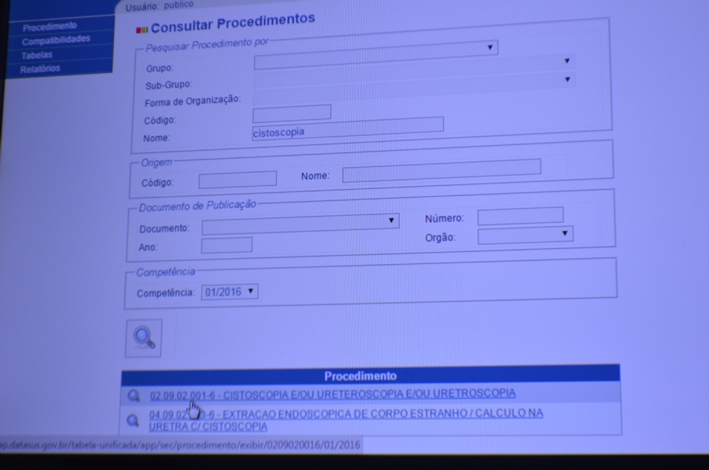 O médico urologista Érico Correia Nepomuceno, denunciado pela artesã Gilvânia Dantas Pereira no Portal Infonet e nas redes sociais, garantiu nesta terça-feira, 26 que não colocou o código errado na guia de internação para a realização de uma Cistoscopia [exame endoscópio das vias urinárias baixas, que visualiza o interior da bexiga]. Mas, o utilizado pelo SIGTAP [Sistema de Gerenciamento da Tabela de Procedimentos do Sistema Único de Saúde –SUS].
