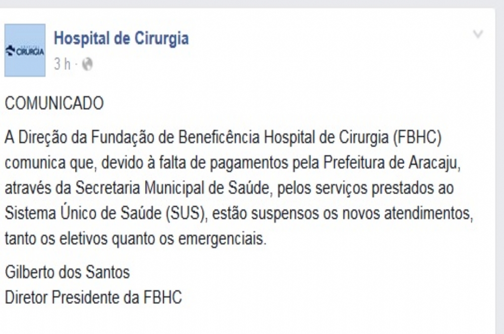 Na manhã desta quinta-feira, 17, o Hospital de Cirurgia (HC) divulgou comunicado onde suspende novamente os novos atendimentos dos serviços prestados ao Sistema único de Saúde (SUS). "A Direção da Fundação de Beneficência Hospital de Cirurgia (FBHC) comunica que, devido à falta de pagamentos pela Prefeitura de Aracaju, através da Secretaria Municipal de Saúde, pelos serviços prestados ao Sistema Único de Saúde (SUS), estão suspensos os novos atendimentos, tanto os eletivos quanto os emergenciais", Gilberto dos Santos Diretor Presidente da FBHC.