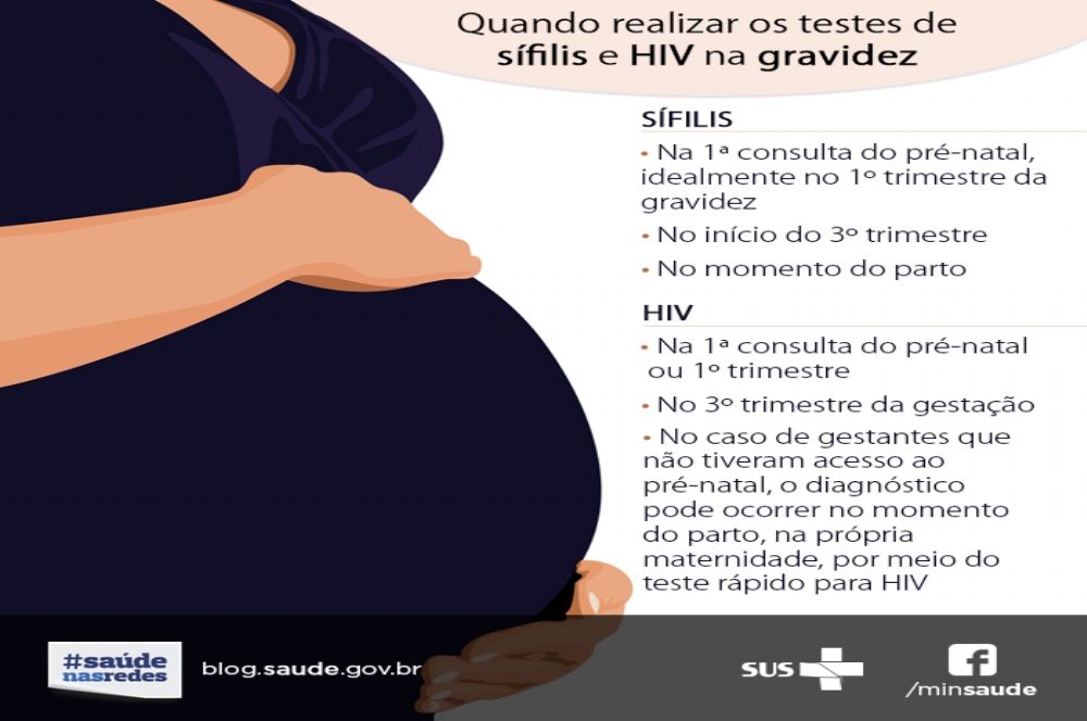 Toda mulher grávida deve fazer o pré-natal e os exames para detectar o HIV e a sífilis. O cuidado é fundamental para evitar a transmissão da mãe para a criança. O teste para diagnosticar a sífilis deve ser feito na 1ª consulta do pré-natal, idealmente no primeiro trimestre da gravidez, no início do 3º trimestre (28ª semana) e no momento do parto (independentemente de exames anteriores), pois a sífilis congênita pode causar aborto e má-formação do feto, entre outros problemas.