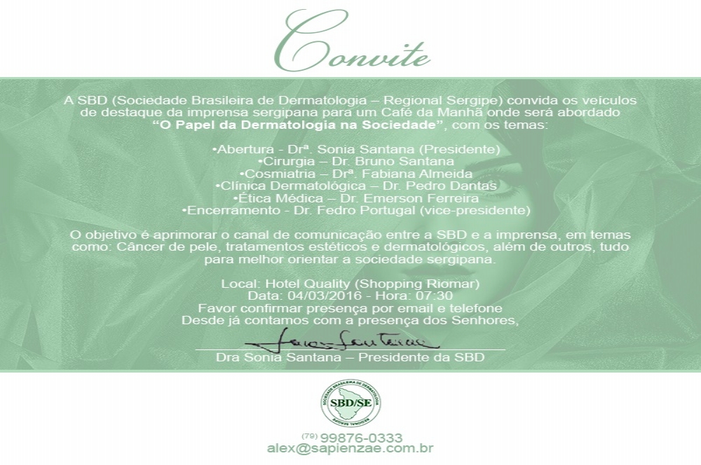 A Sociedade Brasileira de Dermatologia – Regional Sergipe (SBD) convida os veículos de destaque da imprensa sergipana para um café da manhã onde será abordado "O papel da Dermatologia na Sociedade". O evento vai acontecer dia 4 de março, às 7h30 no Hotel Quality (Shopping Riomar).