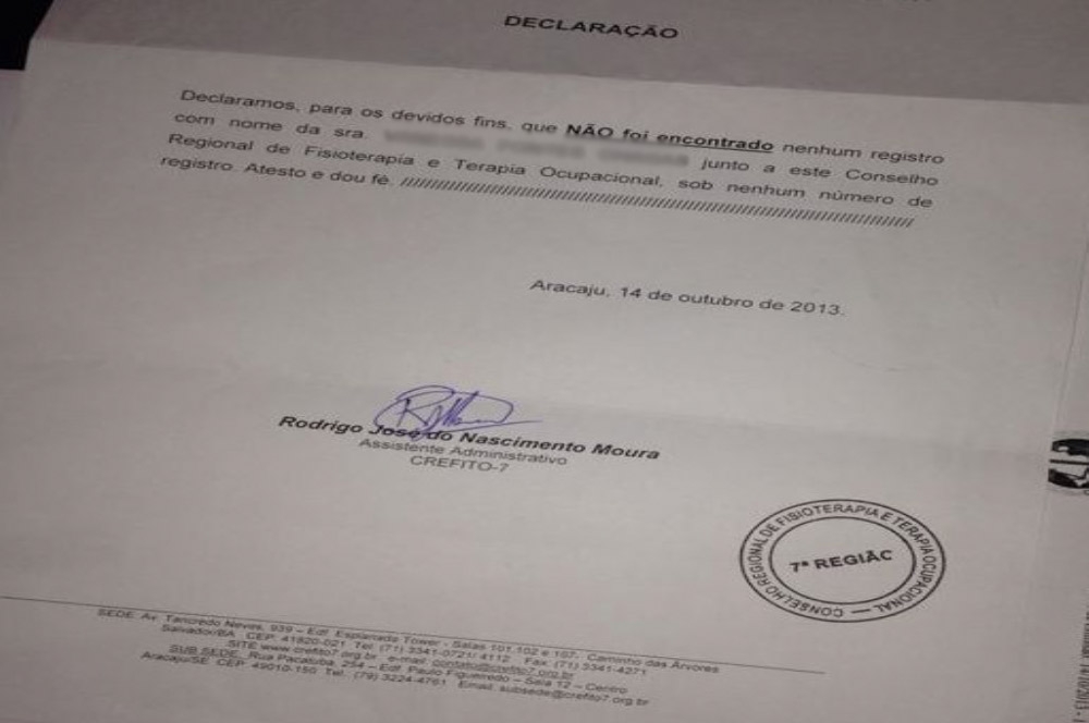 | Documento do Crefito diz que não há registro junto ao órgão com o nome da acusada (Foto: arquivo pessoal) |