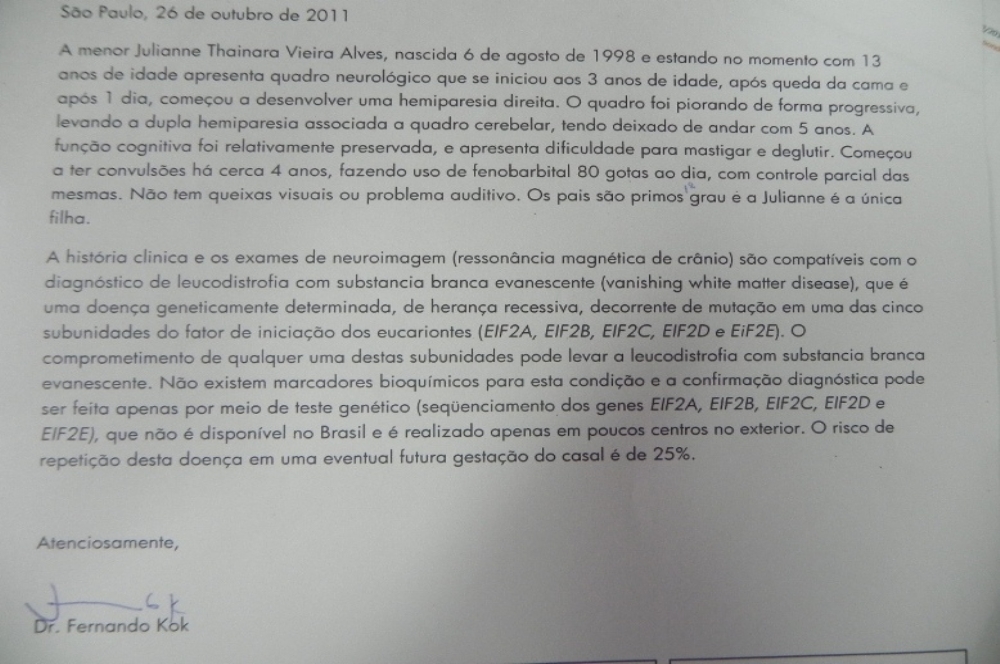 Julianne Thaynara tem 13 anos, mas – conforme diz seu pai – aparenta ter apenas oito. Aos três anos e meio, ela começou a apresentar os sintomas de uma doença rara, a leucodistrofia com substância branca evanescente. O mal, que é de origem genética, ataca o sistema nervoso – o que prejudicou o desenvolvimento motor da garota.