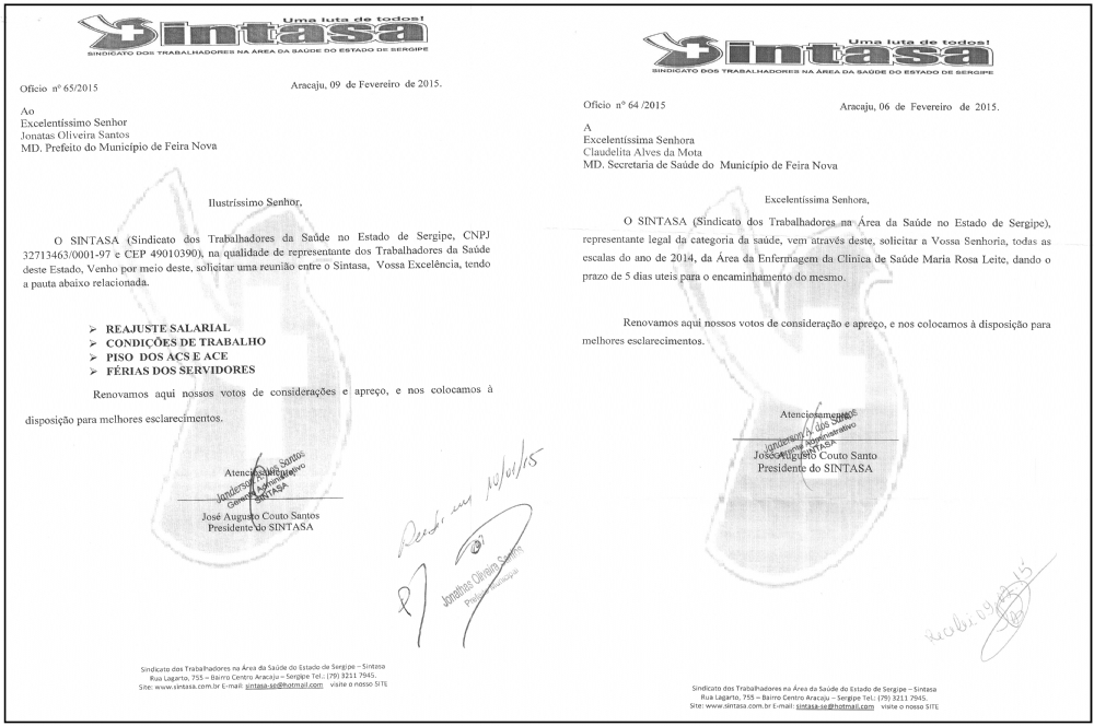 | Ofícios enviados pelo Sintasa à Prefeitura de Feira Nova |