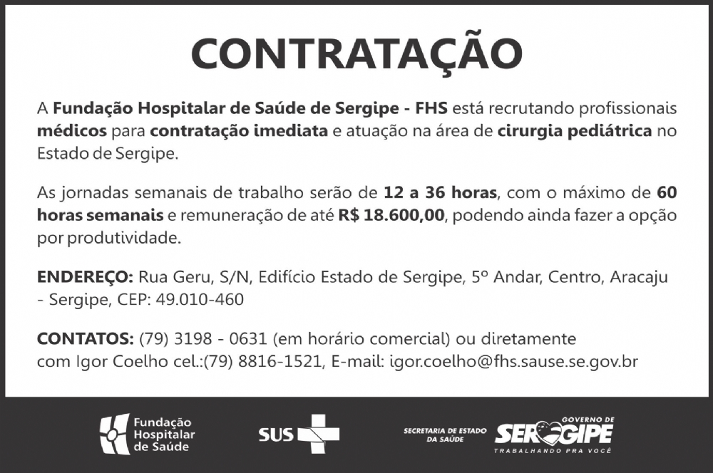 A Fundação Hospitalar de Saúde (FHS) divulga o chamamento público nacional para a contratação imediata de profissionais médicos com atuação na área de cirurgia pediátrica no Estado de Sergipe.