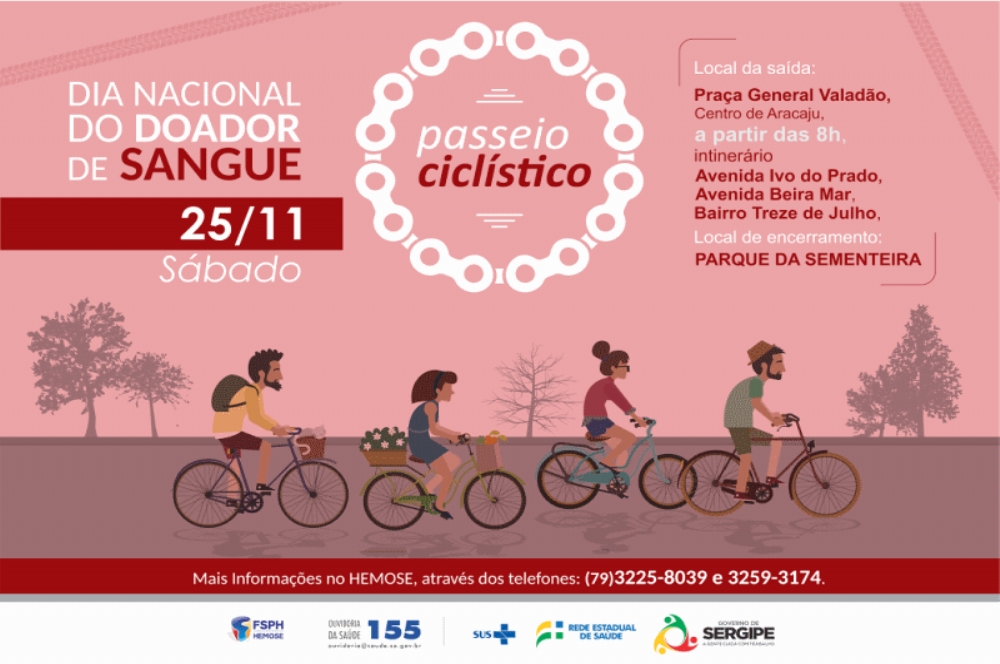 Para marcar Dia Nacional do Doador de Sangue, celebrado no próximo dia 25 de novembro, sábado, o Centro de Hemoterapia de Sergipe (Hemose), unidade da Fundação de Saúde Parreiras Horta (FSPH), que integra a Rede Estadual de Saúde, irá realizar o Passeio Ciclístico Juntos pela Vida. A atividade tem como objetivo destacar a importância da doação de sangue, além de estimular o ato de cidadania e responsabilidade social.