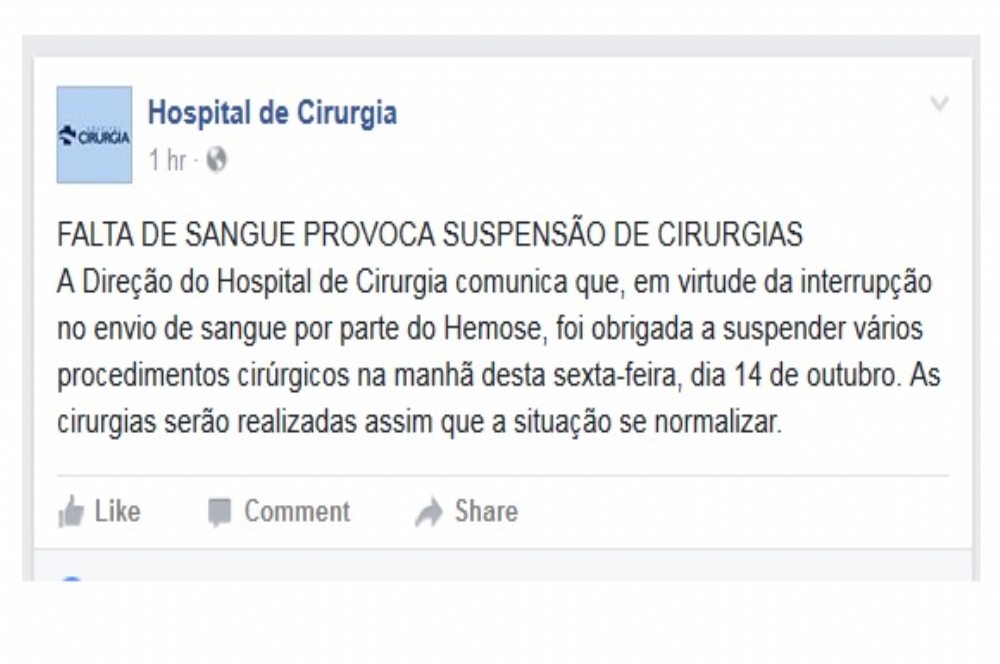 | Hemose diz que está enviando 18 bolsas para o hospital (Foto: Facebook/ Hospital Cirurgia) |