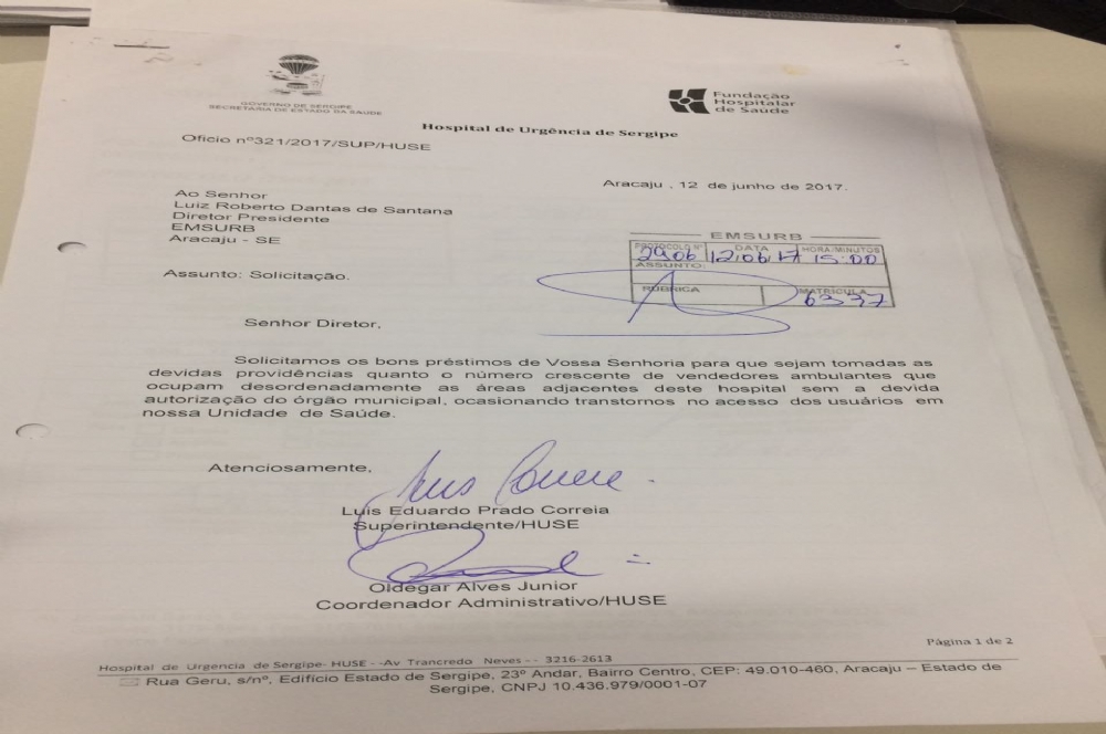 O documento entregue aos ambulantes diz que o motivo da remoção é falta de registro para comercialização naquele espaço. Umm ofício datado de 12 de junho e assinado pela superintendência e coordenação administrativa do Huse, "solicita providências a Emsurb para o crescente número de ambulantes que ocupam o espaço, ocasionando transtornos no acesso dos usuários da unidade", assina o ofício.