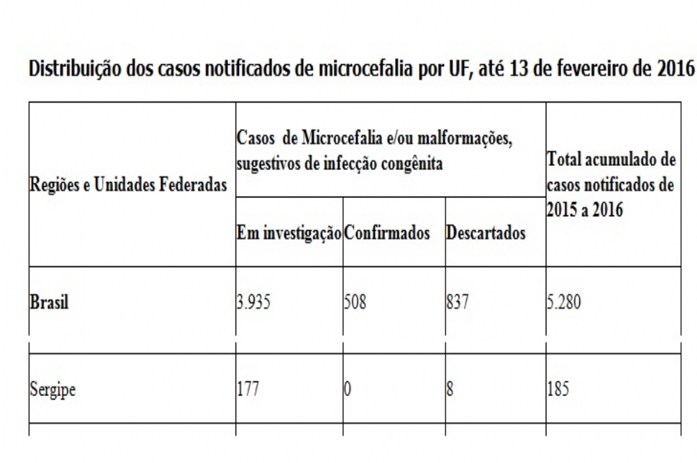No total, foram notificados 108 óbitos por microcefalia e/ou alteração do sistema nervoso central após o parto (natimorto) ou durante a gestação (abortamento ou natimorto). Destes, 27 foram investigados e confirmados para microcefalia e/ou alteração do sistema nervoso central. Outros 70 continuam em investigação e 11 já foram descartados. Ao todo, 5.280 casos suspeitos de microcefalia foram registrados desde o início das investigações em 22 de outubro de 2015 até 13 de fevereiro de 2016.