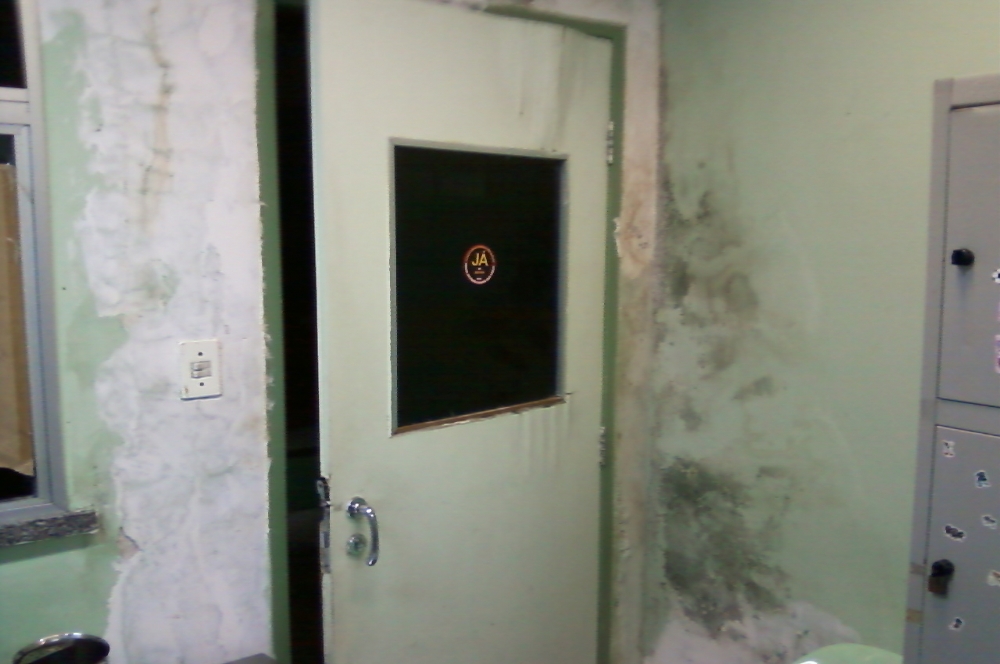 | Porta do laboratório danificada e parede mofada |