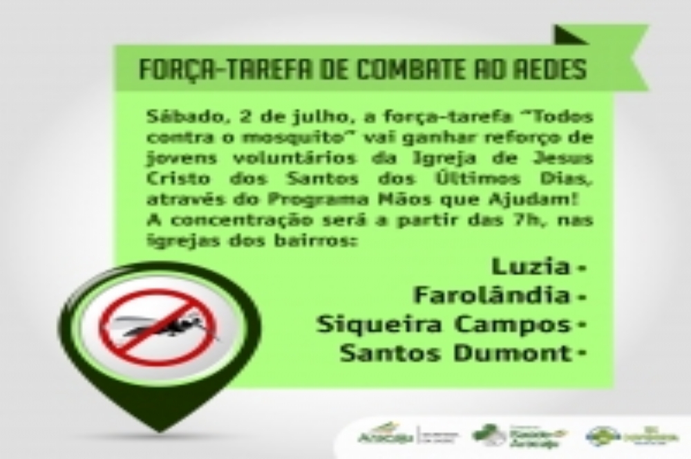 A Prefeitura de Aracaju (PMA), através da Secretaria Municipal da Saúde, segue desenvolvendo ações de combate ao Aedes aegypti, mosquito transmissor da Dengue, Chikungunya e Zika Vírus. No próximo sábado, 2 de julho, a força-tarefa "Todos contra o mosquito" vai ganhar o reforço de jovens voluntários da Igreja de Jesus Cristo dos Santos dos Últimos Dias, que irão visitar, junto com os agentes de Endemias e de Saúde, residências e estabelecimentos comerciais de quatro bairros da capital: Luzia, Farolândia, Siqueira Campos e Santos Dumont. A concentração está marcada para 7h da manhã na sede da igreja de cada bairro e às 8h as equipes estarão nas ruas para identificar e eliminar possíveis focos do mosquito.