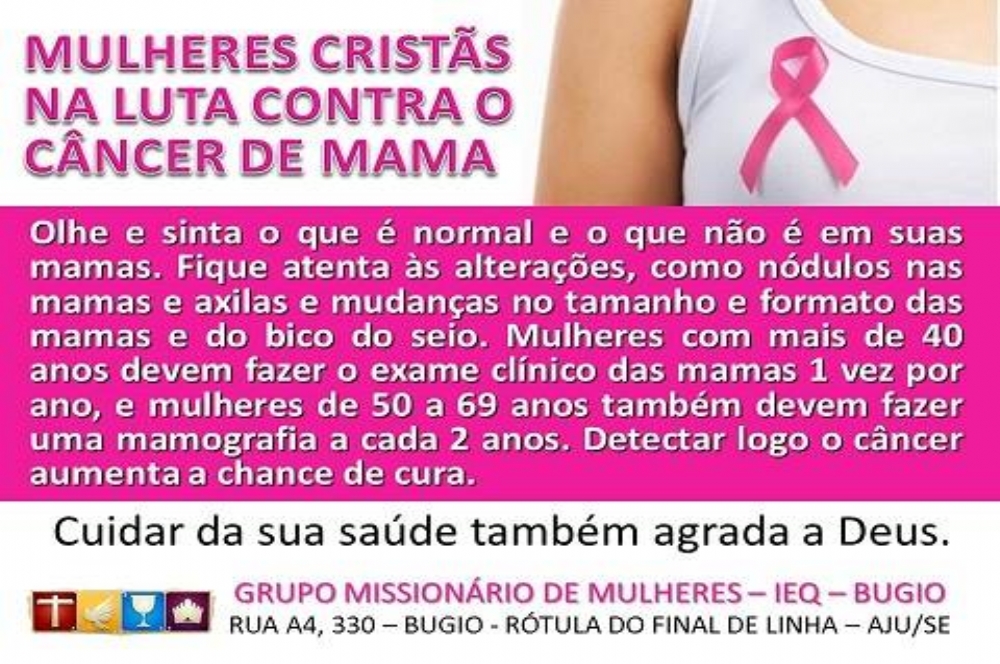 No mês em que as ações estão voltadas para a conscientização quanto aos cuidados da saúde das mulheres o Grupo Missionário de Mulheres (GMM) da Igreja do Evangelho Quadrangular, localizada no bairro Bugio realiza no sábado, dia 19, às 16h, um evento intitulado ‘Caminhada Rosa’.