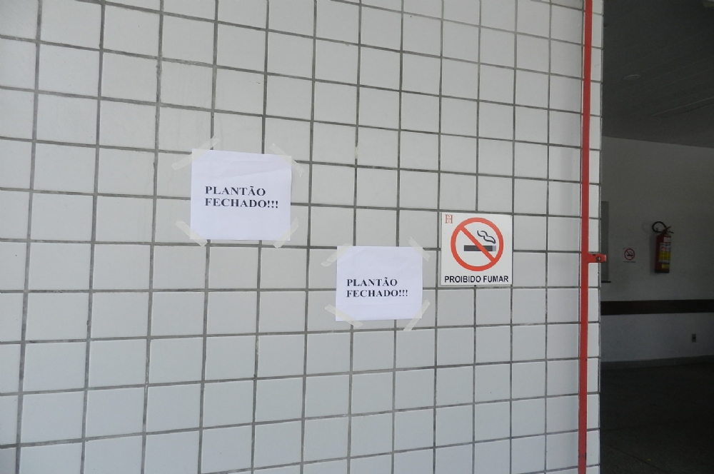 | Um aviso afixado na parede informa que o plantão está fechado |