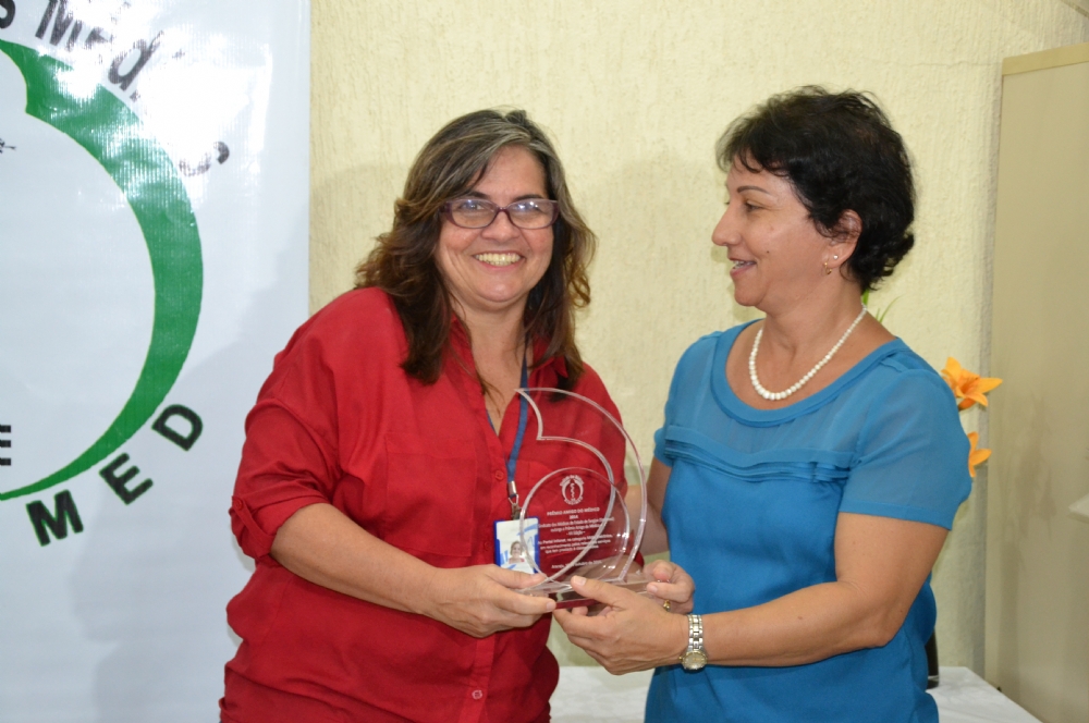 Cássia Santana (à esq) recebe o prêmio das mãos da médica Leila Nacer de Oliveira |