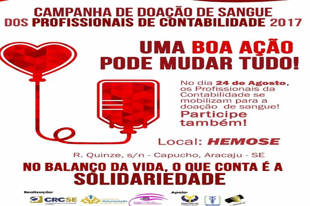 O Conselho de Contabilidade de Sergipe (CRCSE), através da Comissão Estadual da Mulher Contabilista e Programa do Voluntariado da Classe Contábil (PVCC) programou para a próxima quinta-feira, dia 24 de agosto, a realização da décima quarta edição da Campanha de Doação de Sangue dos profissionais de contabilidade do Estado de Sergipe.