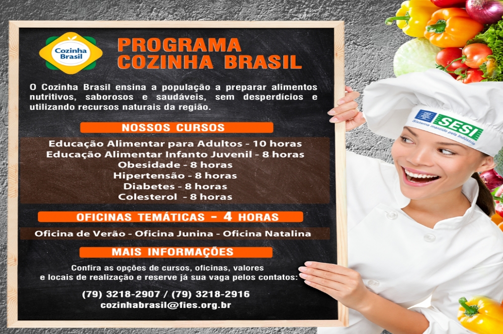 E pensando em tudo isso que o Programa Cozinha Brasil do SESI está com inscrições abertas para seis cursos (Educação Alimentar para Adultos e Infanto Juvenil, Obesidade, Hipertensão, Diabetes, Colesterol) e três oficinas temáticas (Oficina de Verão, Oficina Junina, Oficina Natalina). O programa ensina a população a preparar alimentos nutritivos, saborosos e saudáveis, sem desperdícios e utilizando recursos naturais da região.