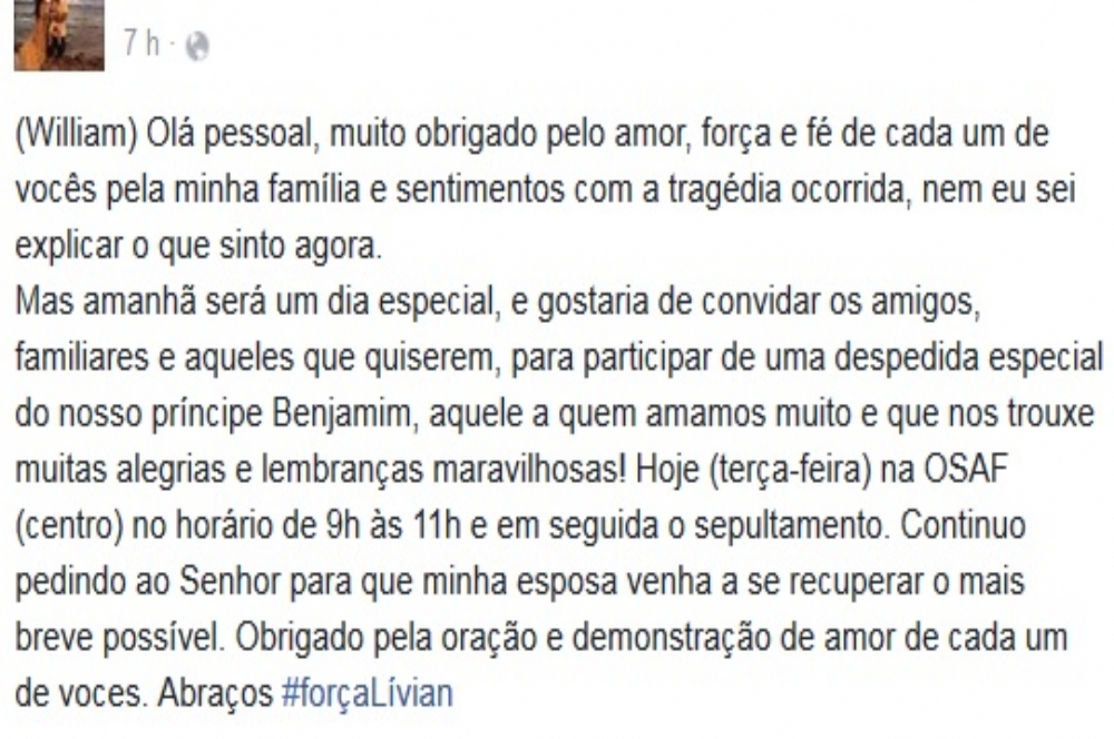 De acordo com a assessoria de comunicação do Huse, Livian foi transferida em estado grave. Em postagem publicada em uma rede social, o esposo de Livian Cristina pede que todos orem pela recuperação da esposa. “Olá pessoal, muito obrigado pelo amor, força e fé de cada um de vocês pela minha família e sentimentos com a tragédia ocorrida, nem eu sei explicar o que sinto agora. Continuo pedindo ao Senhor para que minha esposa venha a se recuperar o mais breve possível. Obrigado pela oração e demonstração de amor de cada um de vocês”, escreveu William Maia em post.
