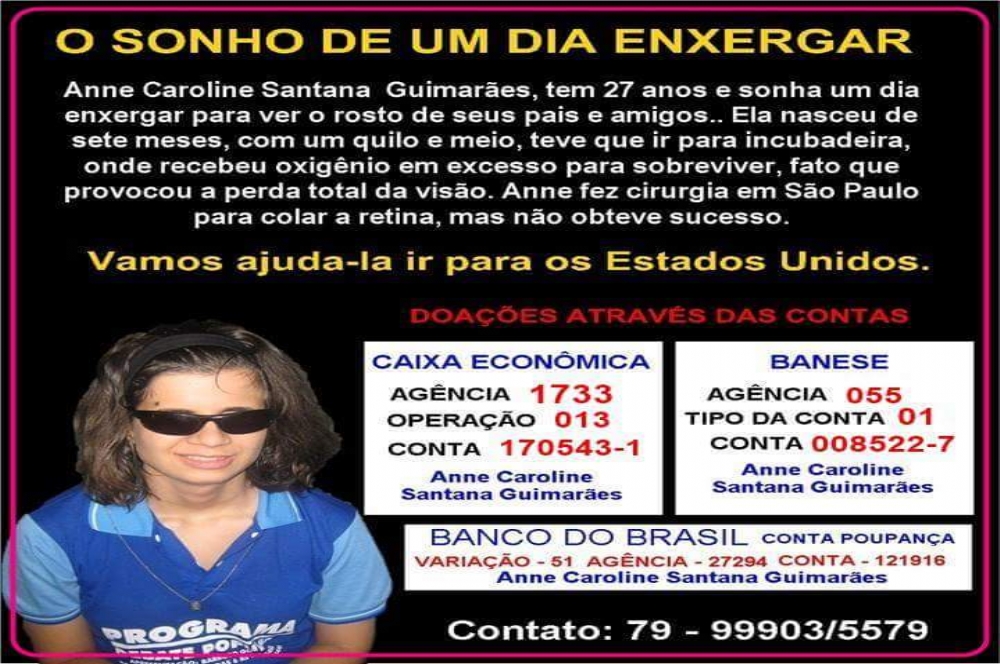 A radialista Anne Caroline Santana Guimarães, conhecida carinhosamente como Carol Guimarães tem o sonho de enxergar e para isso ela acredita que um tratamento em um hospital dos Estados Unidos pode tornar esse sonho realidade.