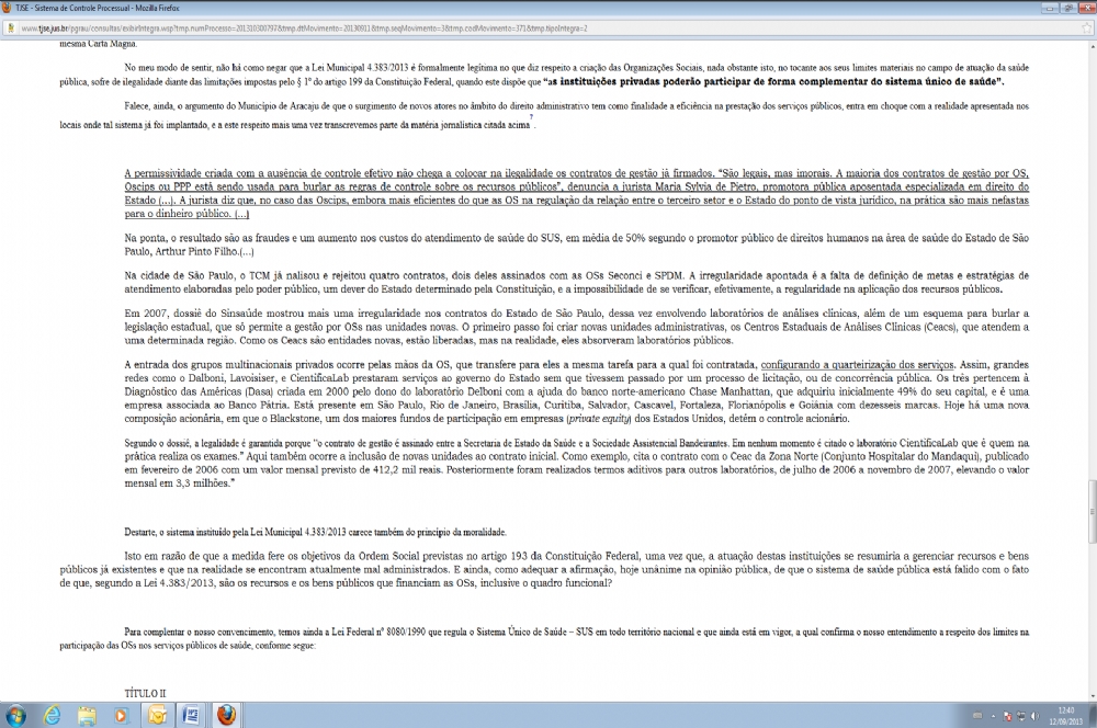 Mas os argumentos da prefeitura não convenceram a juíza. Apesar de entender como formalmente legítima a lei municipal que estabelece a criação da OS, a juíza vê ilegalidade quanto ao campo de atuação destas organizações na saúde pública diante das imposições estabelecidas pela Constituição Federal. A juíza também questiona a eficiência do novo modelo e destaca trechos de matérias veiculadas na imprensa nacional, revelando a natureza imoral dos procedimentos adotados em São Paulo.