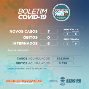 A Secretaria de Estado da Saúde (SES), através do boletim epidemiológico, informou que nesta segunda-feira, 18, foram registrados 07 casos novos de Covid-19 e nenhum óbito. No total, 326.909 pessoas testaram positivo para a doença e 6.339 morreram.