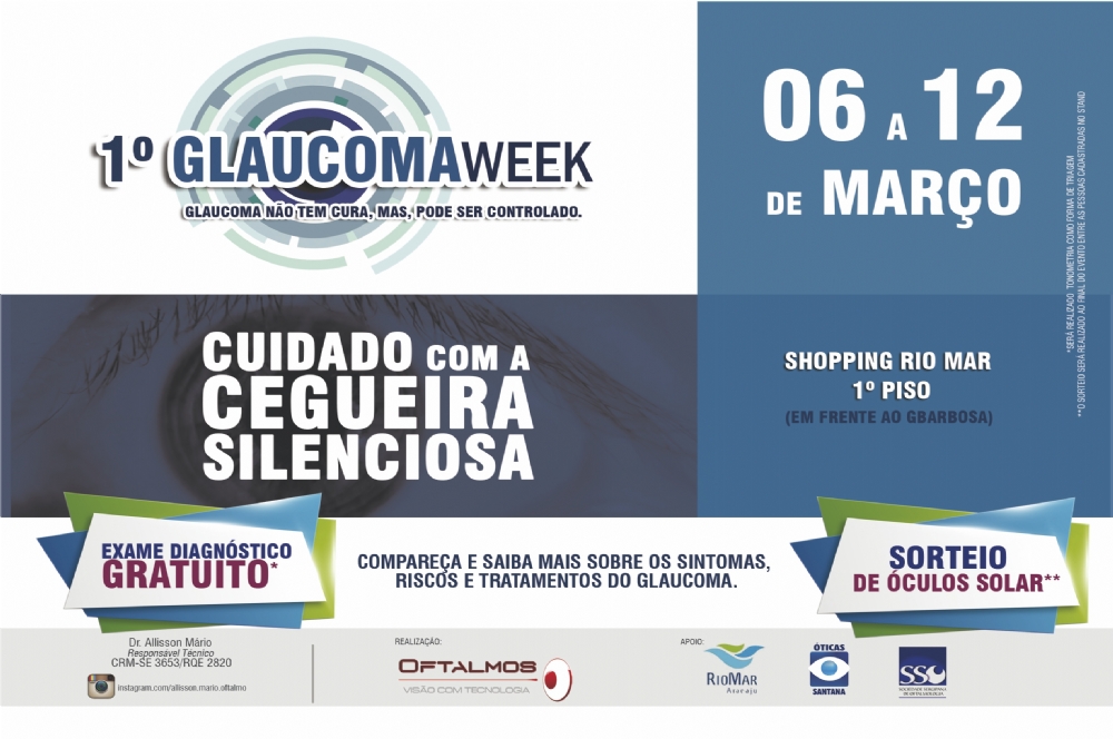 Em Sergipe, alguns oftalmologistas participarão do 1º Glaucoma Week (Semana do Glaucoma) que será realizado a partir do dia 06 de março até 12 de março de 2016 no Shopping Rio Mar em parceria com a clínica Oftalmos, levando informações sobre o problema ocular aos pacientes que desconhecem ter o glaucoma e sem sentir nada perdem a cada dia um pouco de sua visão, além disso, será realizada gratuitamente uma triagem simples de quem pode estar com a doença. O Glaucoma pode ser evitado com uma simples visita ao oftalmologista e realização de exames preventivos, por isso, a classe médica se mobiliza nesta semana para alertar e lembrar a população.
