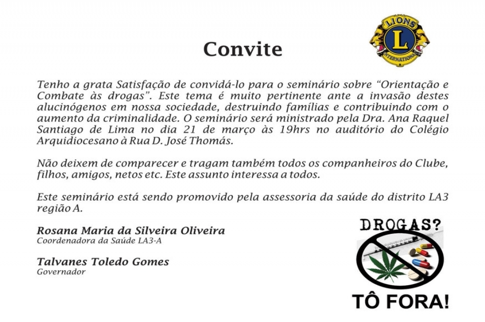 Na noite desta quarta-feira, 21, será realizada uma palestra sobre o uso frequente da droga na sociedade. De acordo com a organização do seminário o evento vai tratar do aumento da criminalidade com o grande avanço das drogas.