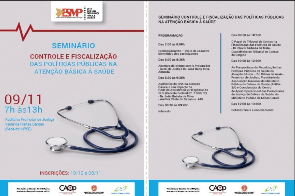 A Escola Superior do Ministério Público de Sergipe (ESMP) e o Centro de Apoio Operacional dos Direitos à Saúde com o apoio do Conselho Estadual da Saúde realizarão, no dia 09 de novembro, das 7h às 13h, na Sede do MP-SE, o “Seminário: Controle e Fiscalização das Políticas Públicas na Atenção Básica à Saúde”