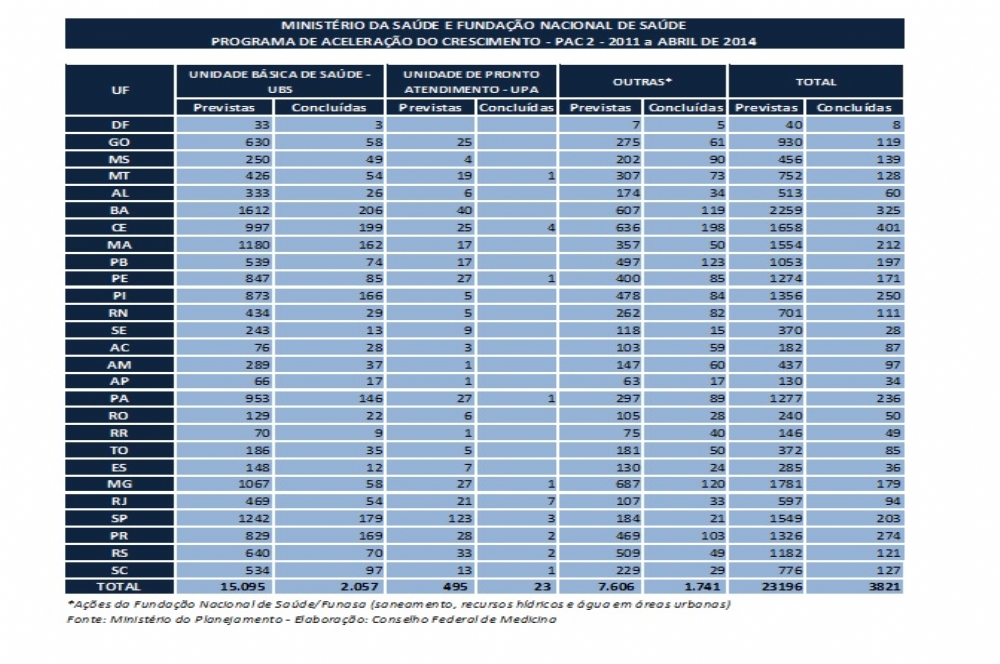 Em 2011, foram prometidas a construção ou ampliação de 243 UBSs, das quais apenas 13 foram concluídas. Também estavam previstas nove UPAs, mas, até abril de 2014, nenhuma havia sido concluída. Também constam no Programa iniciativas de saneamento voltadas a qualidade da saúde em áreas indígenas, rurais e melhorias sanitárias nas cidades. Dentre as 118 ações desta natureza, 15 foram entregues.