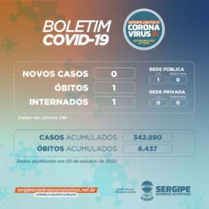 O óbito confirmado foi de uma mulher, 62 anos, de Aracaju, com neoplasia, doença renal crônica, doença cardiovascular, sequelas de acidente vascular encefálico, obesidade, ex-tabagista e ex-etilista.