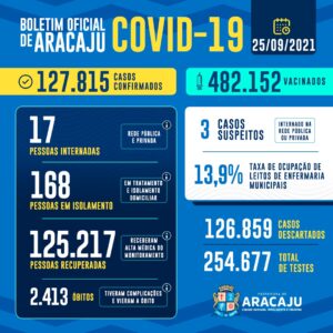 A SMS informa também que foram registrados 27 novos casos de covid-19 na capital e nenhum óbito nas últimas 24h, contabilizando 25 dias consecutivos sem óbitos em Aracaju.