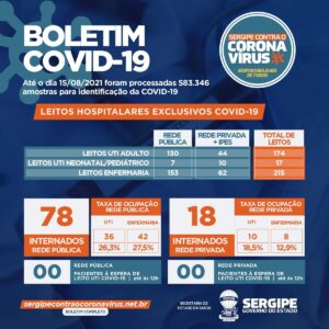 A Secretaria de Estado da Saúde (SES) divulga neste domingo, 15, o boletim epidemiológico do coronavírus com 44 casos novos e um óbito que estava em investigação e foi confirmado. Em Sergipe, 276.865 pessoas já testaram positivo para a Covid-19 e 5.948 morreram. Até o momento, 266.840 pacientes foram curados. O óbito foi um homem, 52 anos, de Itabaiana, sem comorbidade.
