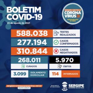 A Secretaria de Estado da Saúde (SES) divulga nesta segunda, 23, o boletim epidemiológico do coronavírus com sete casos e três óbitos que estavam em investigação e foram confirmados. Em Sergipe, 277.194 pessoas já testaram positivo para a Covid-19 e 5.970 morreram. Até o momento, 268.011 pacientes foram curados.