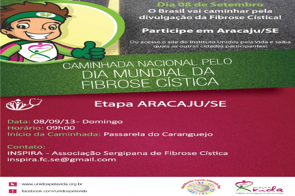 A Associação Sergipana de Fibrose Cística em parceria com o Instituto Unidos pela Vida luta pela divulgação da Fibrose Cística estarão promovendo uma caminhada no dia 8 de setembro, a partir das 9h, com a concentração na Passarela do Caranguejo. O principal objetivo é divulgar a doença genética, grave e sem cura, ainda muito desconhecida não só da população em geral, como também dos profissionais de saúde