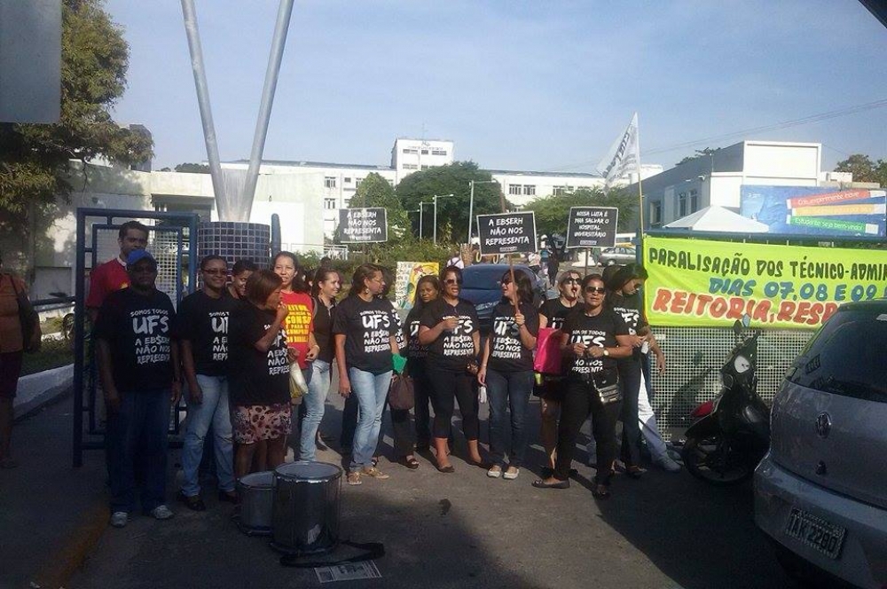 Servidores técnicos do Hospital Universitário (HU) realizaram um ato na manhã desta quarta-feira, 08, na porta da unidade hospitalar. Vestidos com os dizeres 'Somos todos UFS, a EB$ERH não nos representa', os servidores fecharam os portões de entrada de veículos do Hospital Universitário (HU/UFS).