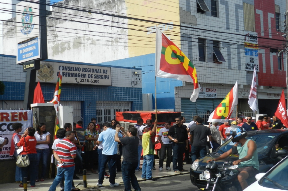 Na manhã de hoje, 15, o Sindicato dos Enfermeiros do Estado de Sergipe (Seese) e o Sindicato dos Servidores em Conselhos de Fiscalização nas Entidades Coligadas e Afins do Estado de Sergipe (Sindiscose) realizaram manifestação em frente ao Conselho Regional de Enfermagem (Coren).