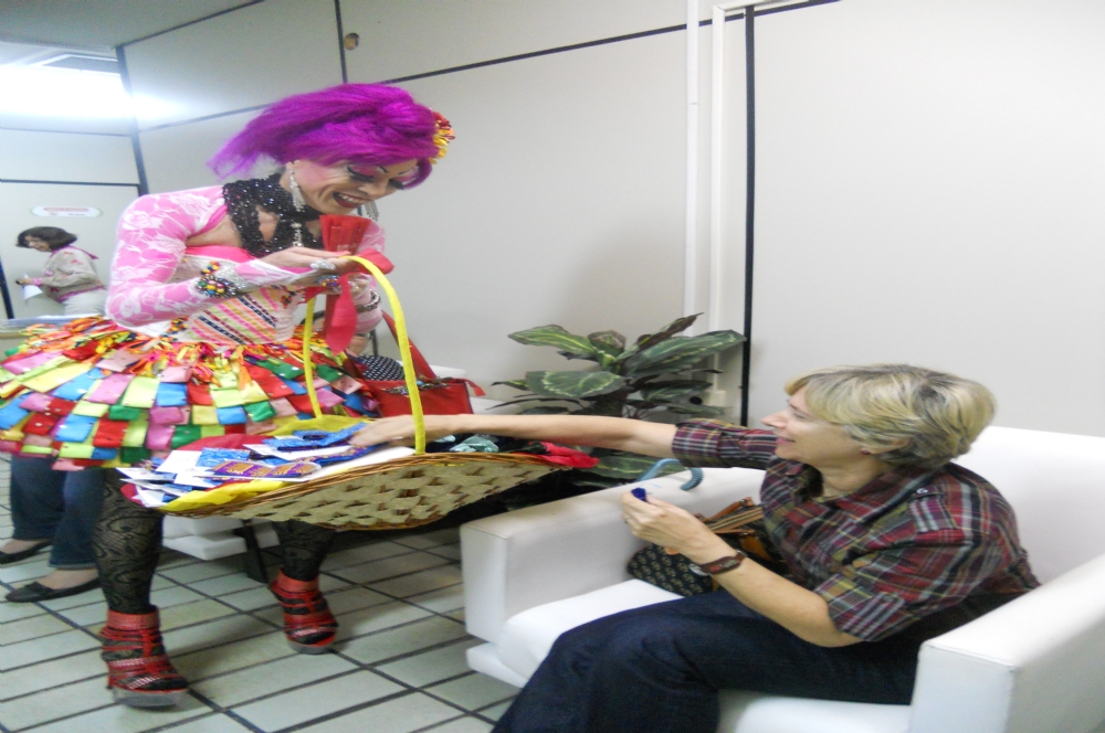 Os servidores da Secretaria Municipal de Saúde (SMS) foram surpreendidos nesta terça feira, 12, quando é comemorado o dia dos namorados, por uma irreverente ação educativa. Com a presença da drag queen Kharolyne Prínscipal, foram distribuídos kits com camisinhas, gel lubrificante, buttons e, é claro, uma mensagem bem humorada a favor do uso da camisinha para prevenção das Doenças Sexualmente Transmissíveis (DST’s).