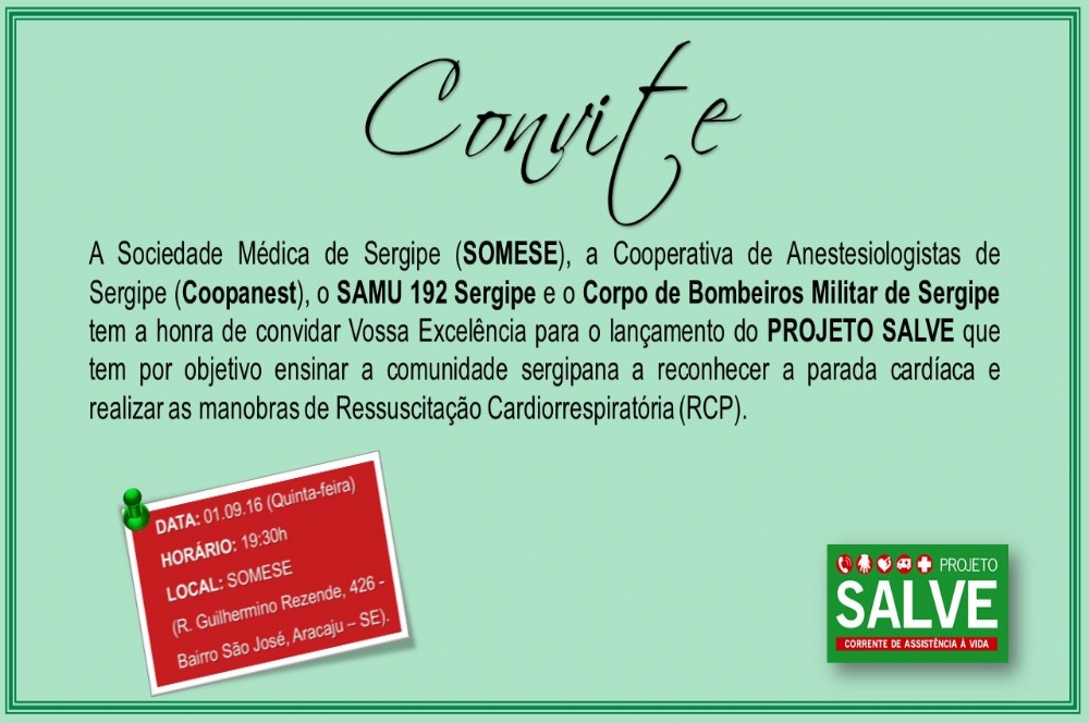 Atenta a essas possibilidades, a Sociedade Médica de Sergipe (Somese), o Corpo de Bombeiros Militar 193 (CBM-SE), o Serviço de Atendimento Móvel de Urgência (Samu 192) e a Cooperativa dos Anestesiologistas de Sergipe (Coopanest/SE) se uniram através do Projeto Salve. Esse Projeto tem como objetivo ensinar a população a reconhecer uma parada cardiorrespiratória e realizar, imediatamente, os procedimentos de ressuscitação cardiopulmonar, de acordo com a corrente de assistência à vida. O treinamento é gratuito e tem duração de quatro horas.