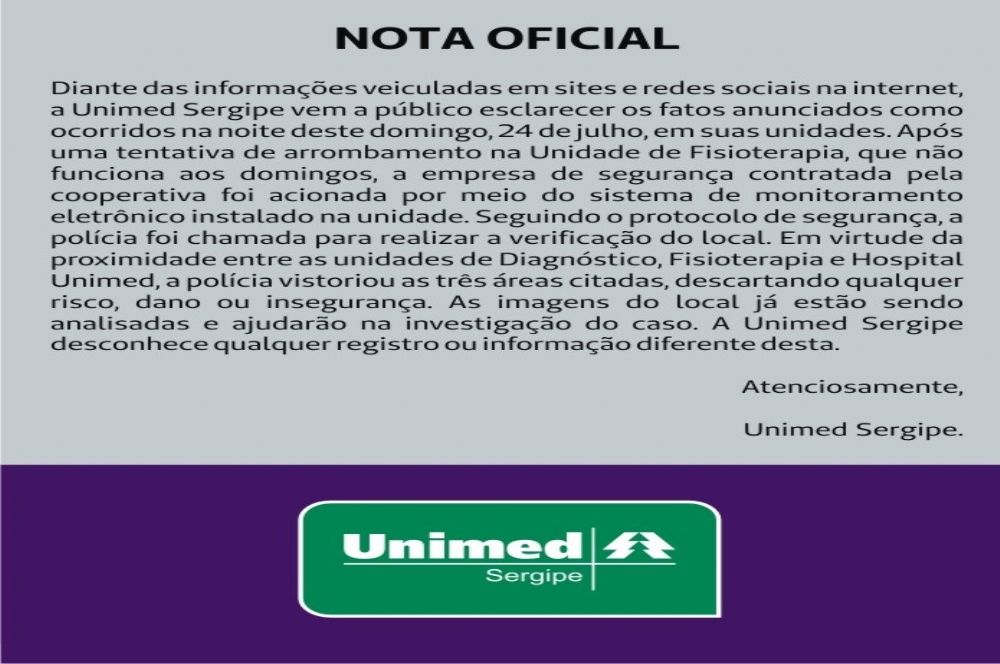 De acordo com a assessoria de comunicação da Unimed existiu uma uma tentativa de arrombamento na Unidade de Fisioterapia, que não funciona aos domingos, "mas a empresa de segurança contratada pela cooperativa foi acionada por meio do sistema de monitoramento eletrônico instalado na unidade. Seguindo o protocolo de segurança, a polícia foi chamada para realizar a verificação do local. Em virtude da proximidade entre as unidades de Diagnóstico, Fisioterapia e Hospital Unimed, a polícia vistoriou as três áreas citadas, descartando qualquer risco, dano ou insegurança. As imagens do local já estão sendo analisadas e ajudarão na investigação do caso. A Unimed Sergipe desconhece qualquer registro ou informação diferente desta", esclarece a nota.