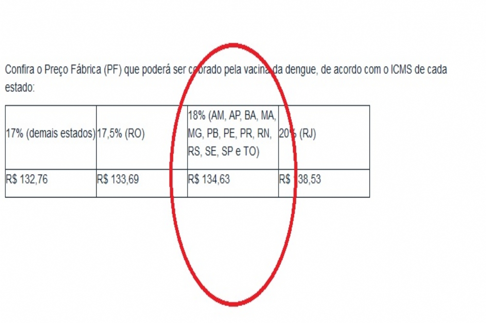 A dose da vacina da dengue no Brasil, produzida pela empresa Sanofi-Aventis Farmacêutica Ltda., vai custar entre R$ 132,76 e R$ 138,53. Essa é a variação do teto do “Preço Fábrica” (PF), com o qual este produto poderá ser comercializado nas diferentes alíquotas do ICMS vigentes no Brasil.
